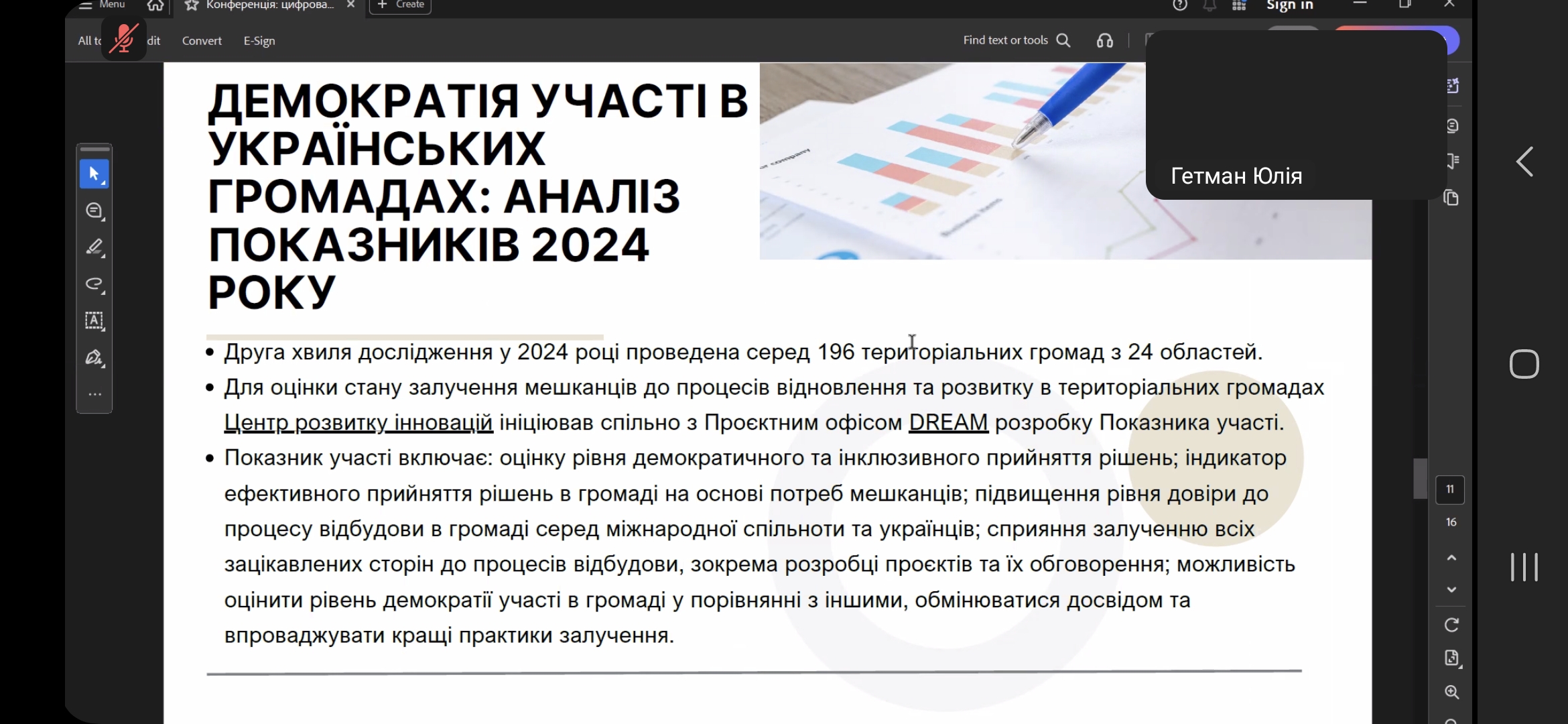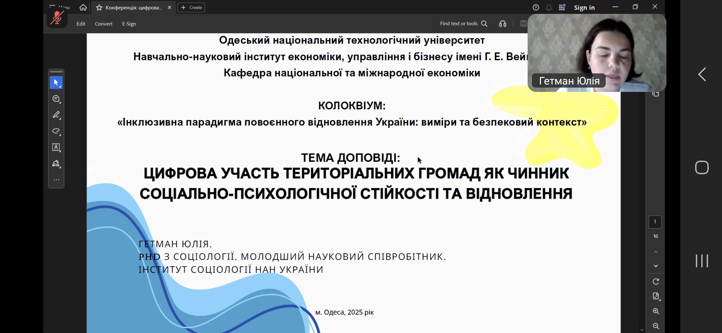 • Юлія Гетман, доктор філософії з соціології, молодший науковий співробітник Інституту соціології НАН України, за темою «Цифрова участь територіальних громад як чинник соціально-психологічної стійкості та відновлення»;