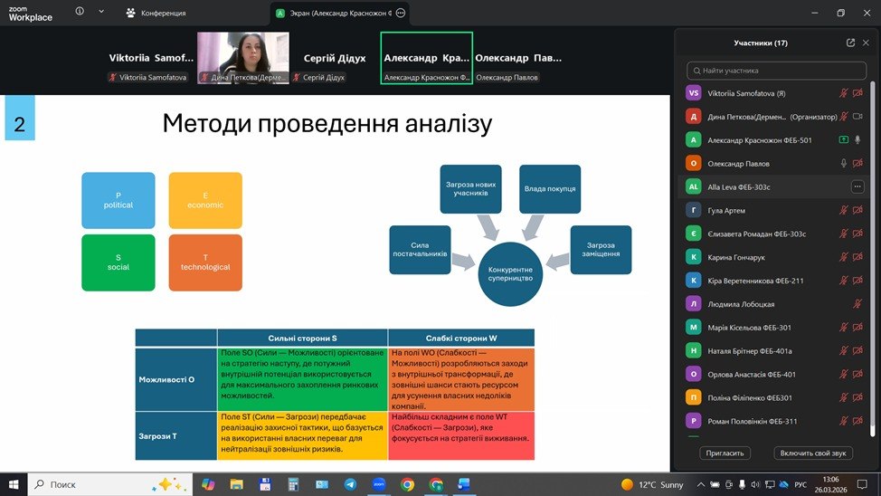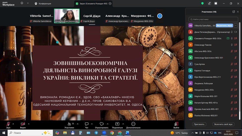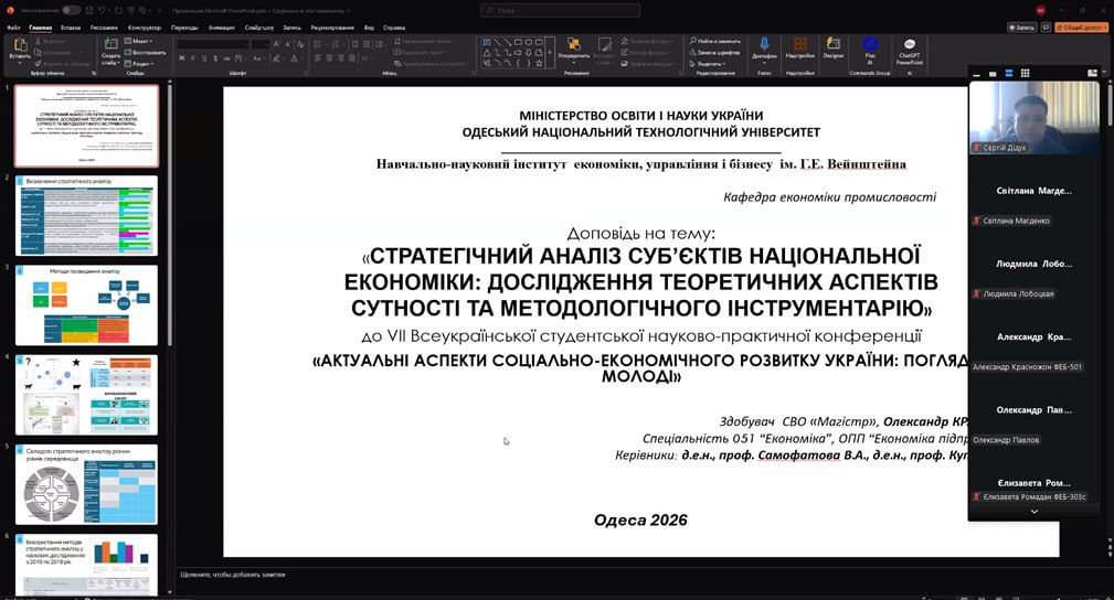 26 березня 2026 року на кафедрі національної та міжнародної економіки ННІ економіки, управління і бізнесу ім. Г.Е. Вейнштейна Одеського національного технологічного університету відбулося засідання секції національної та міжнародної економіки в межах наукової конференції здобувачів освіти.