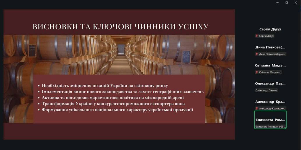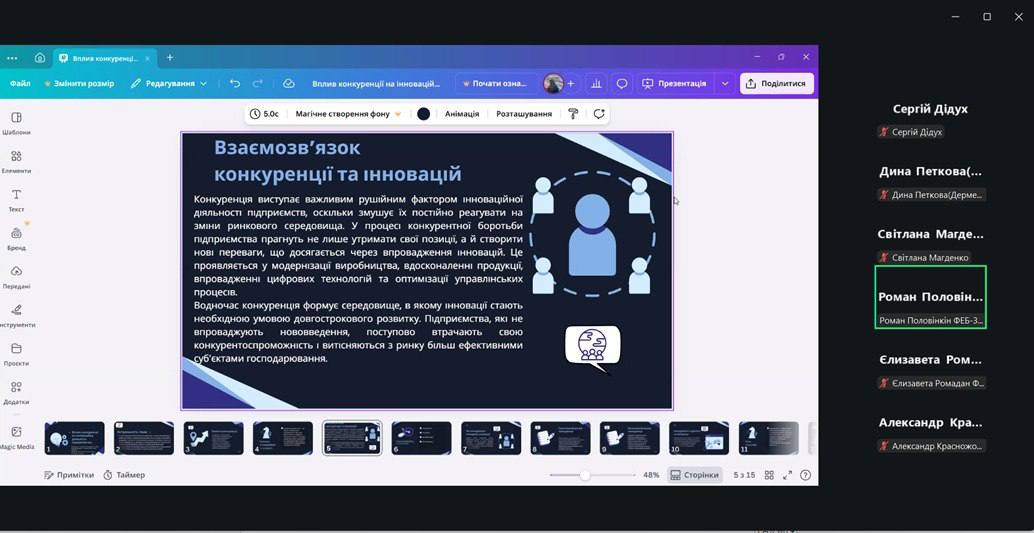 У ході роботи секції було представлено широкий спектр наукових доповідей, що відзначалися актуальністю, аналітичною глибиною та практичною спрямованістю. Особливу увагу учасників привернули виступи окремих доповідачів. Зокрема, ґрунтовною та методологічно вивіреною була доповідь магістра Красножона О.С. на тему стратегічного аналізу суб’єктів національної економіки. Доповідач продемонстрував високий рівень теоретичної підготовки, глибоке розуміння сутності стратегічного аналізу та сучасного інструментарію його реалізації, що викликало жваве обговорення серед учасників. Актуальні питання розвитку зовнішньоекономічних зв’язків виноробної галузі України висвітлила Ромадан Є.К. У своїй доповіді вона акцентувала увагу на викликах та можливостях інтеграції галузі у світові ринки, підкресливши важливість адаптації до сучасних економічних умов та пошуку нових напрямів експорту. Змістовною та практично орієнтованою була також доповідь Веретенникової К.Г., яка спільно з Половінкіним Р.К. дослідила вплив конкурентного середовища на інноваційну активність підприємств. У виступі було обґрунтовано ключову роль конкуренції як драйвера інноваційного розвитку та запропоновано підходи до підвищення ефективності діяльності підприємств в умовах динамічного ринку.